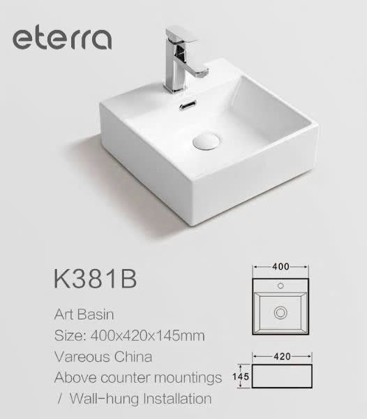 Chậu lavabo ETR.K381B chưa bao gồm vòi. Quý khách có thể chọn vòi lavabo nhỏ gọn phù hợp với kích thước chậu hoặc tham khảo các mẫu vòi tại ETERRA.