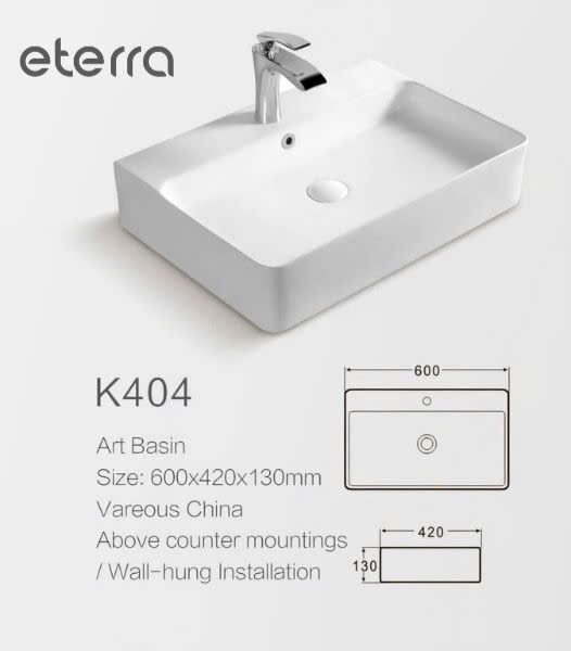 Chậu lavabo ETR.K404 chưa bao gồm vòi. Quý khách có thể chọn vòi lavabo riêng theo sở thích hoặc tham khảo các mẫu vòi phù hợp tại ETERRA.