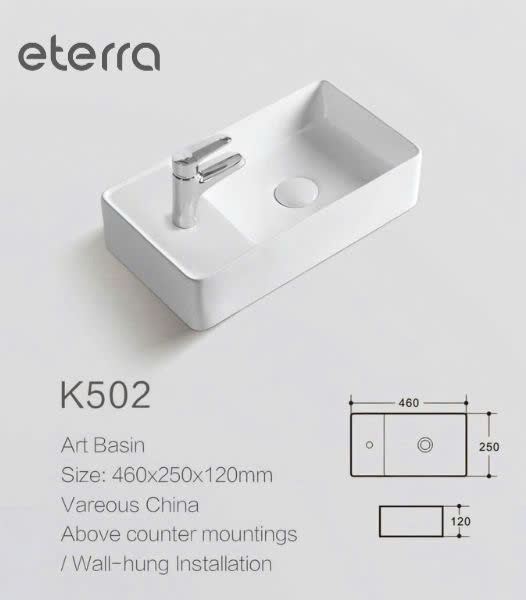 Chậu lavabo ETR.K502 chưa bao gồm vòi. Quý khách có thể chọn vòi lavabo nhỏ gọn phù hợp với kích thước chậu hoặc tham khảo các mẫu vòi tại ETERRA.